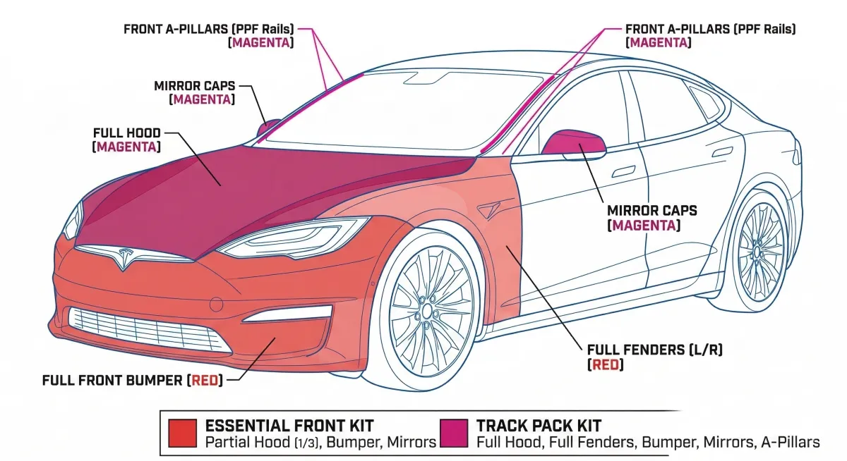 Partial Front: Covers the front bumper, 1/3 of the hood, and side mirrors. (The "Essential" protection).